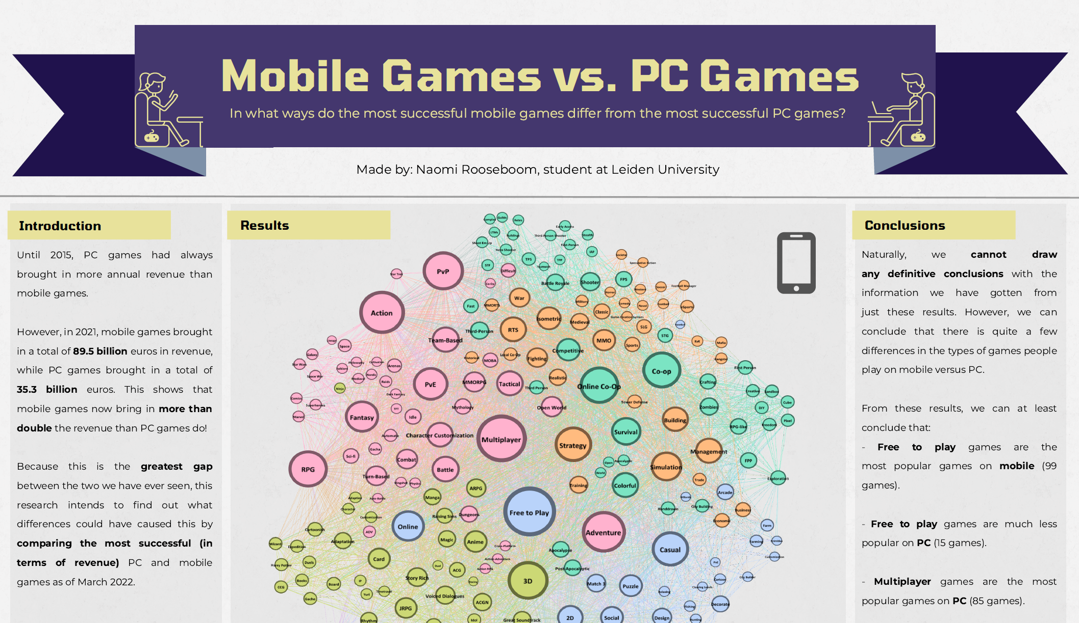 This project researches whether there is a difference between mobile games and PC games in terms of general aspects such as the number of users, geographic location, and age demographic of its users, and more specific aspects such as game genres, tags, price, and monetization.